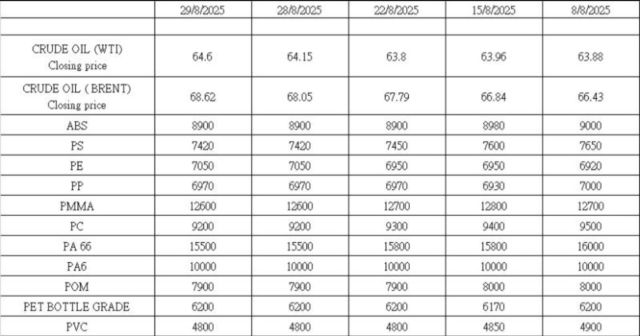 2025年8月29日現在のプライム、リサイクル、スクラッププラスチックの市場更新情報です。