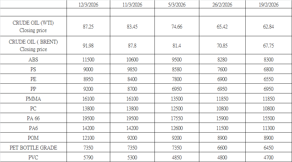 今週のABS市場は、地政学的リスクの高まりと原油価格の急激な変動を背景に、著しい変動を見せました。週初めのコスト上昇に続き、利益確定売りと短期的な調整局面を経て、スチレン原料価格の回復に伴い再び価格が上昇しました。利華誼、中国石油化工、浙江石油化学などの主要生産者は複数回にわたり提示価格を引き上げ、価格の大幅な変動につながりました。市場心理は依然として複雑で慎重な様相を呈しており、参加者の間では投機的な動きと様子見の動きが混在しています。